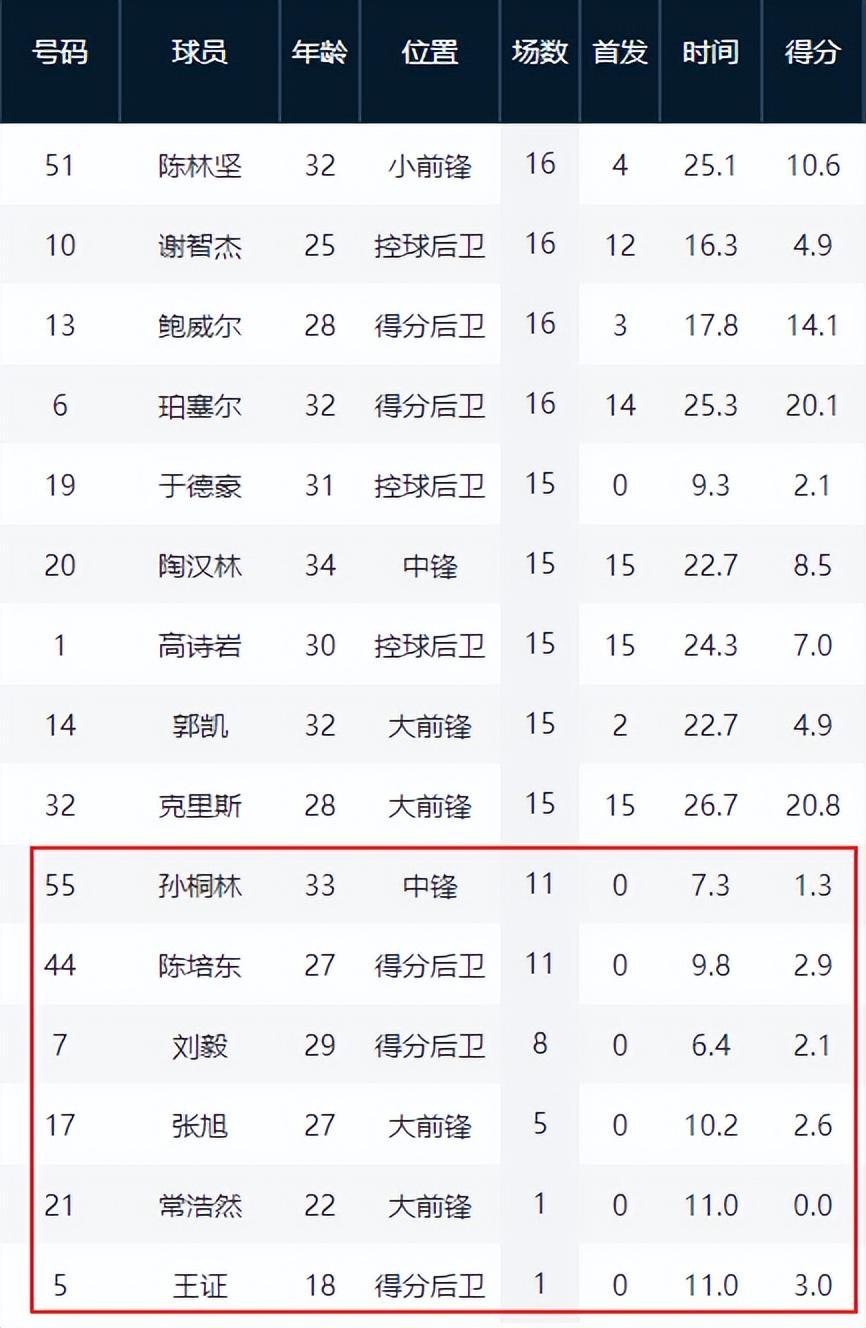 陈培东本赛季上场时间锐减,场均只有9.8分钟,但出场次数达到11次。尤其是从客场对阵北京以后,他的出场机会明显增加,其具有“神经刀”属性的三分球投射,在某些时候还是可以为球队带来帮助的。因此,陈培东被挤出的可能性也不是很大。